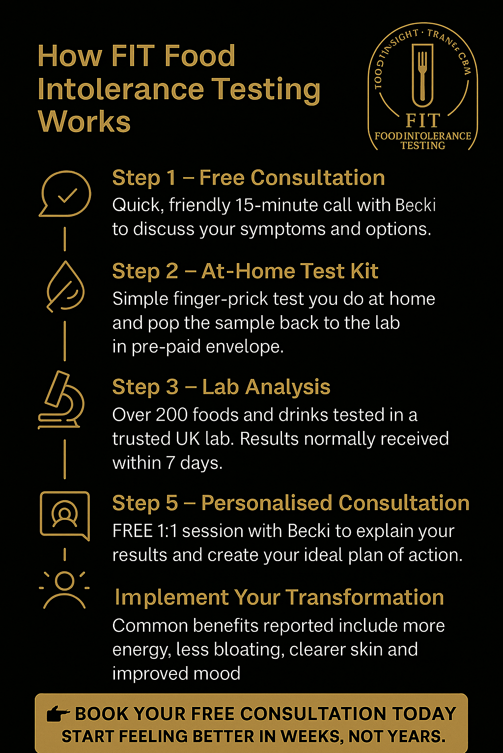 Join the growing number of satisfied clients who have transformed their health and wellbeing with FIT Food Intolerance Testing. The premium test designed to identify hidden food triggers, reduce symptoms, and optimise your wellness